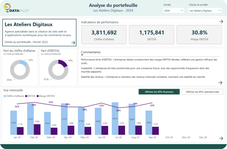 Nous développons avec vos équipes le tableau de bord qui vous permet de suivre de manière rigoureuse vos chiffres. En connectant vos bases comptables, financières et vos fichiers de budgets, vous retrouvez la liberté d’analyser vos chiffres.